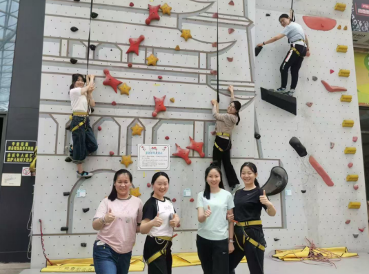 攀巖環節將活動推向高潮。在專業教練指導下,團員們穿戴護具,依次挑戰8米高的巖壁。面對陡峭的賽道,隊員們以“敢為人先”的勇氣迎難而上,指尖緊扣巖點,腳步穩扎穩打,用汗水詮釋“奮斗是青春最亮麗的底色”。許多人從最初的緊張到逐漸突破自我,最終登頂時全場歡呼。“巖壁上的每一步都需要專注和勇氣,就像工作中攻克難關一樣,當代青年亦需在挑戰中突破自我!”大家感慨道。